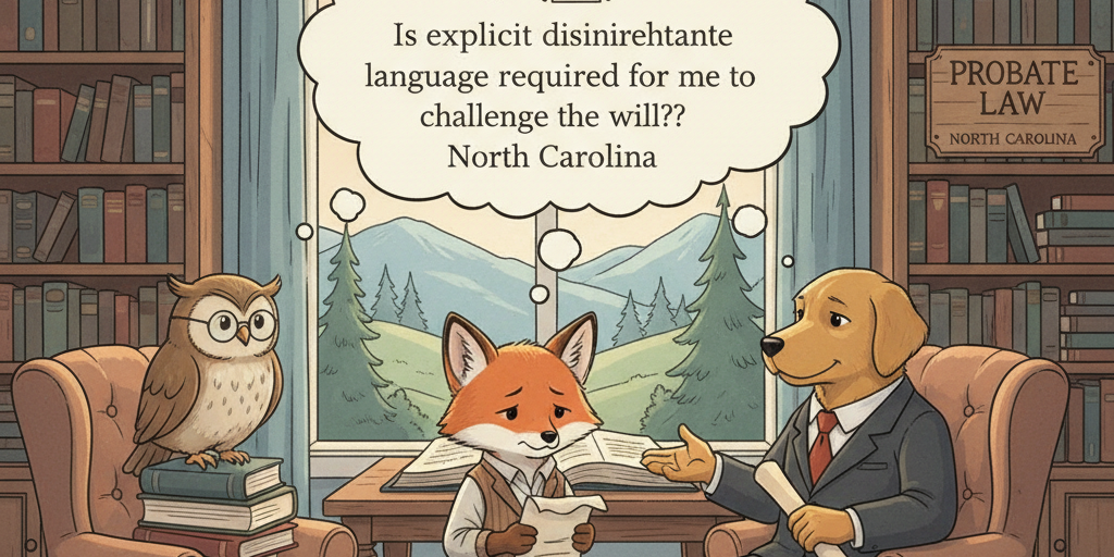 You’re asking whether a North Carolina will must expressly say you are disinherited before you can contest it. The will here gives all property to adult children and omits you; you were a minor when the will was signed. The issue is whether omission, without explicit disinheritance wording, affects your ability to challenge the will in probate.