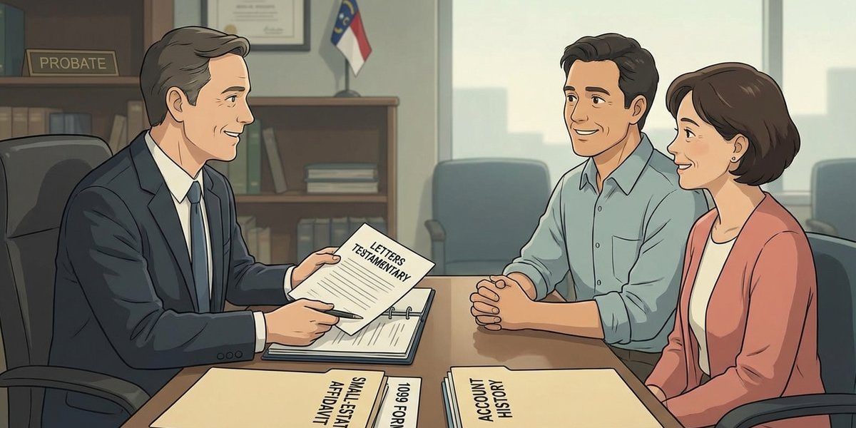 In North Carolina probate, the key question is what proof of authority a person must show to a financial institution to obtain a deceased account holder’s records—such as monthly statements, signature cards, and year-end tax forms—when no executor or administrator has been appointed. The issue usually comes up in a small-estate administration where the estate needs bank records to identify assets, confirm ownership, and prepare required filings, but the bank refuses to release anything without formal “letters” or a separate court order.